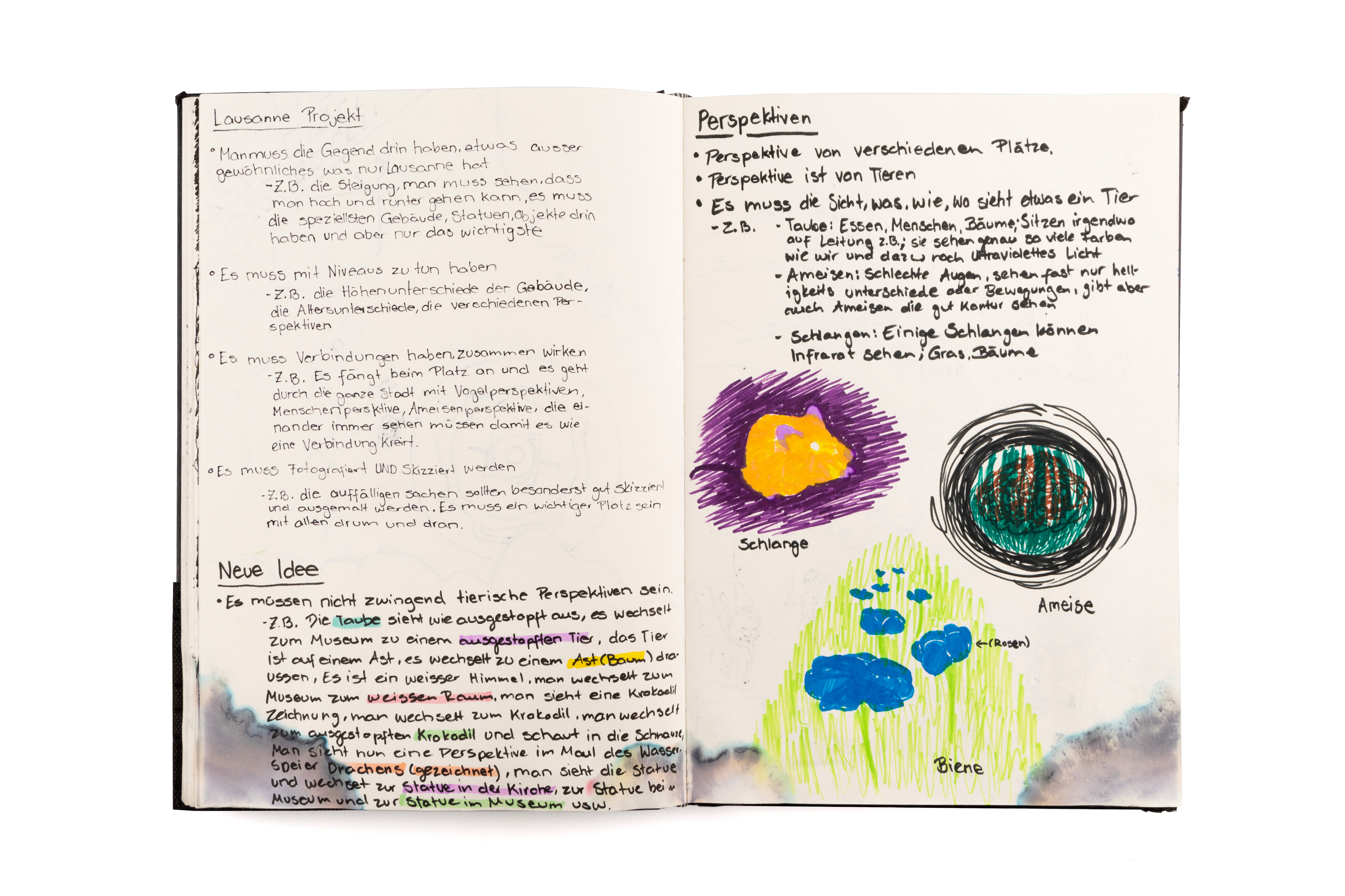 Mein Stift in der rechten Hand, das Skizzenbuch auf den Knien und meine Augen wandern in der Menschenmeute gehetzt umher. So sah mein Alltag aus, während dem Lausanne Vorprojekt. Es ging darum, einen Ort auszusuchen und sich darüber zu informieren, spannende Ereignisse aufzuzeichnen und schlussendlich ein Heft daraus zu erstellen. Ich hatte mir einen Park ausgesucht, da meistens in diesen viel los ist. Was ich mir vorgestellt hatte, ist, dass jeder und jede eine bestimmte Routine besitzt und ich hatte mir eine für den Park vorgestellt. Familien mit Kindern und Haustieren, Verliebte, zwitschernde Vögel usw.