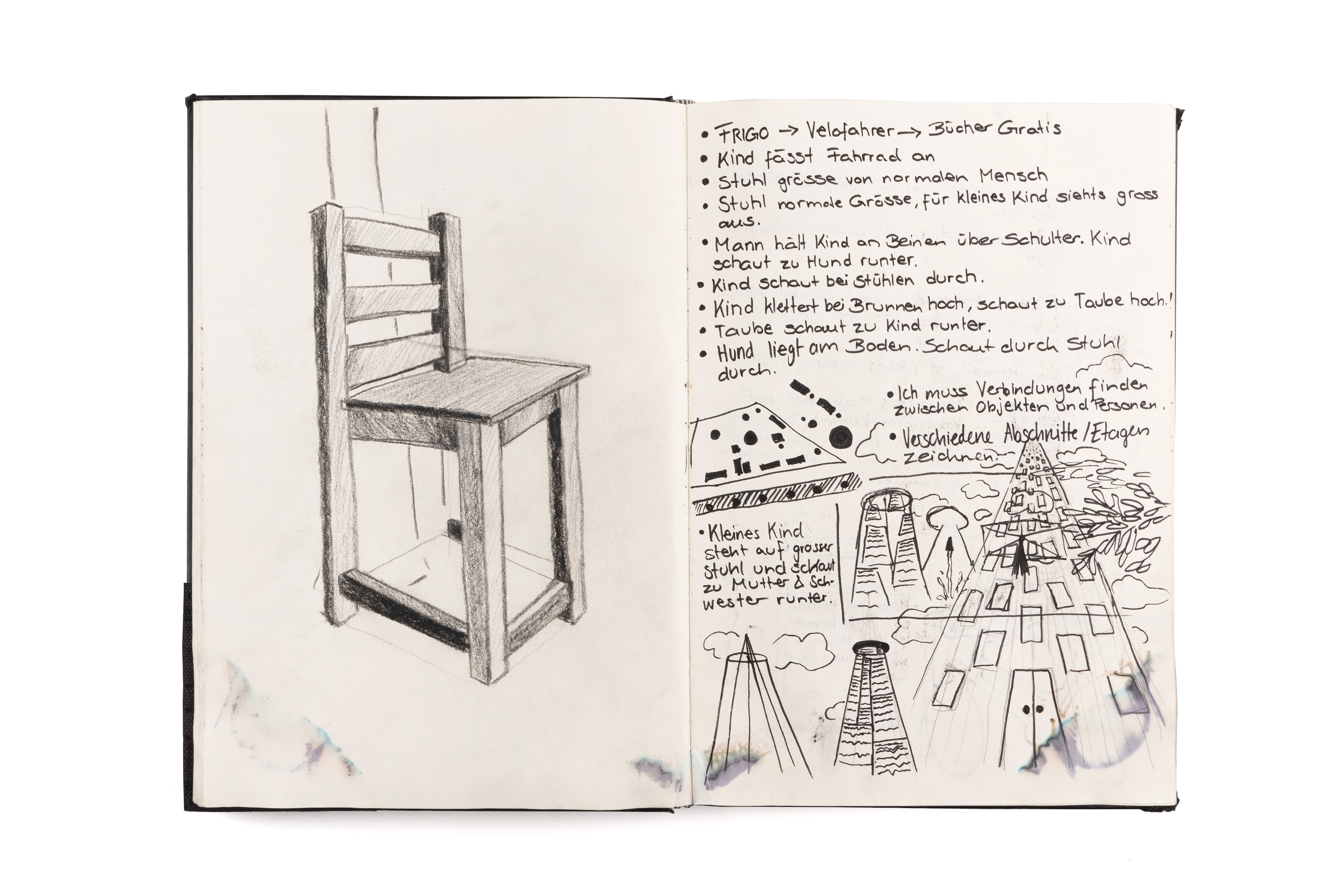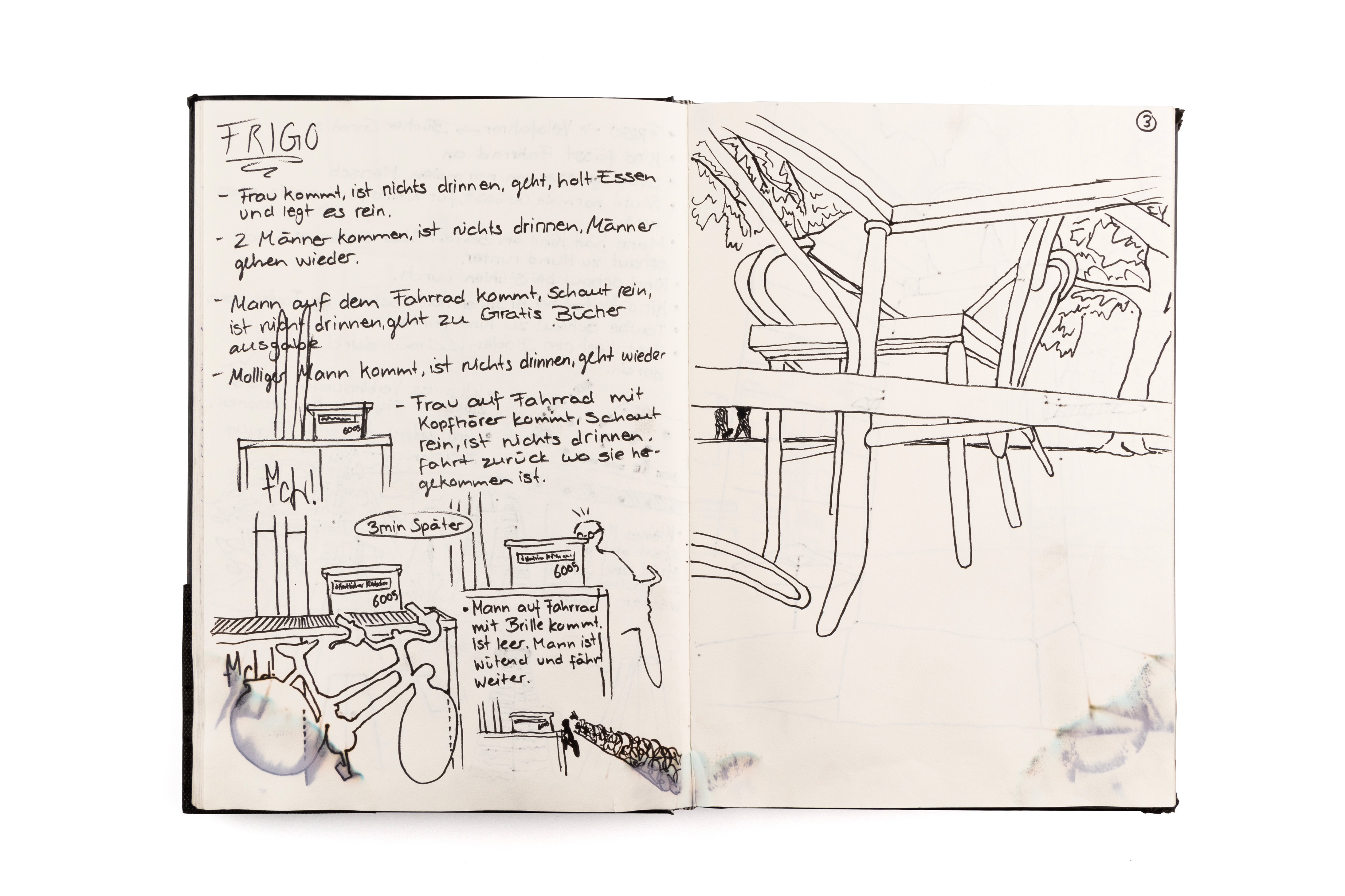 My pen in my right hand, the sketchbook on my knees and my eyes wandering around in the crowd of people. This is what my everyday life looked like during the Lausanne preliminary project. It was about choosing a place and finding out about it, recording exciting events and finally creating a booklet from it. I had chosen a park, because there is usually a lot going on in them. What I had in mind is that everyone and anyone has a certain routine and I had envisioned one for the park. Families with kids and pets, people in love, birds chirping, etc.