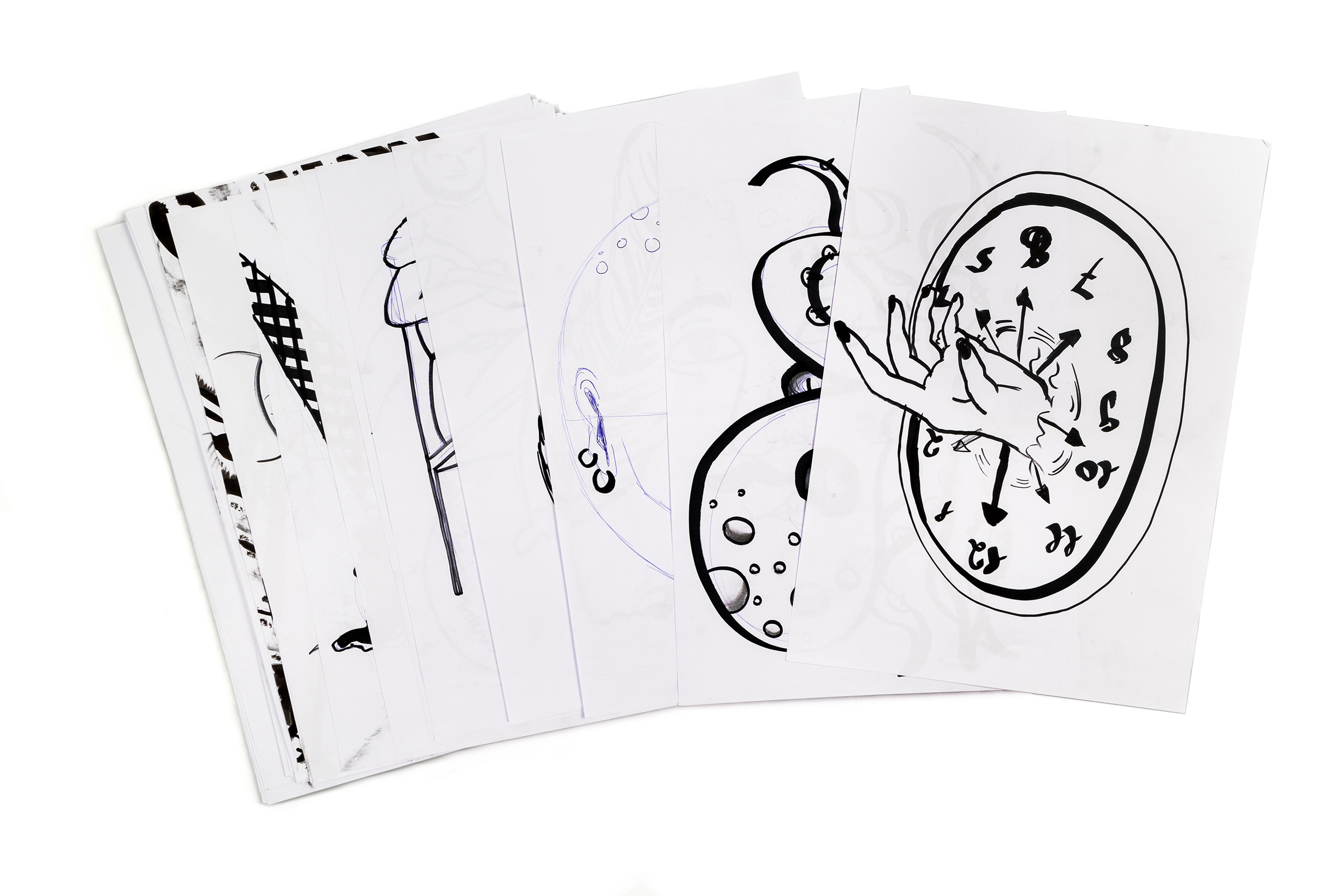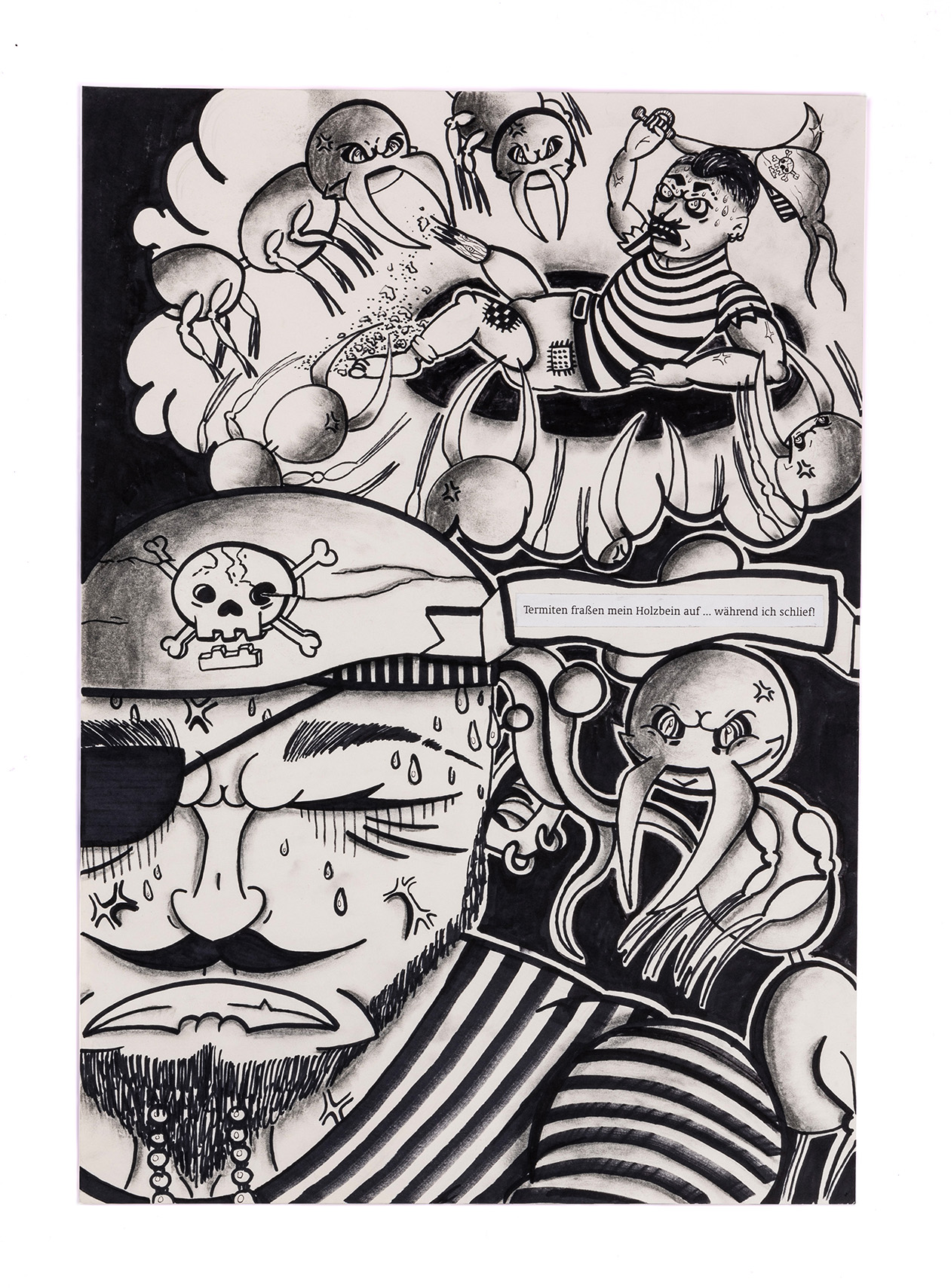 50 Blätter, 50 Begriffe, 1 Studentin und ein sehr schmales Zeitfenster. Das waren die Vorgaben, um ein Bild aus einigen dieser Begriffen zu kreieren. Da mein Zeichnungsstil sowieso dem eines Comics ähnelt, bin ich zum Schluss gekommen, das Bild doch gleich als Comic zu gestalten. Aber das war noch nicht alles. Neu dazugekommen ist der Auftrag, zu einem gelosten Satz eine Zeichnung zu malen. Mein Satz lautete «Termiten frassen mein Holzbein auf…während ich schlief!»